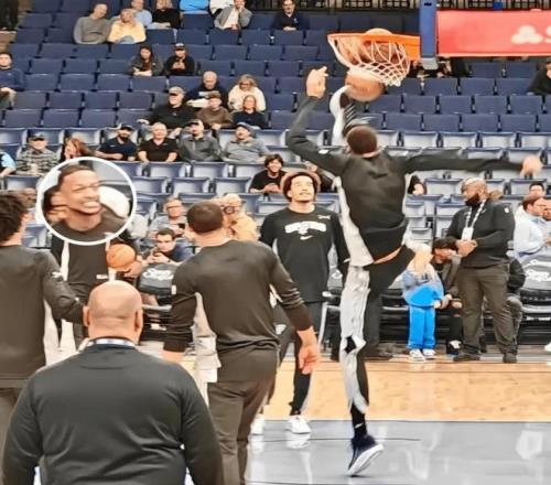 有意思的是根据美国媒体NBA Memes晒出的另个角度照片,看得出文班亚马一只脚还没有离地,他就能踢到篮网,画面真的很很离谱。