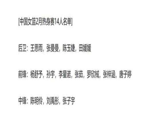 去年的全运会之后,马上就进行了新赛季的WCBA女篮联赛。而在联赛常规赛进行的后半段,中国女篮就进行了一次集训,杨舒予、陈明伶等球员去到国家队报到,训练。国家队也是特意感谢了各家俱乐部的配合和支持。而随着2月1日,常规赛结束,女篮国家队再度进行了一下人员的微调:张子宇、王思雨回归。宫鲁鸣带领14名球员,开始新的热身赛。